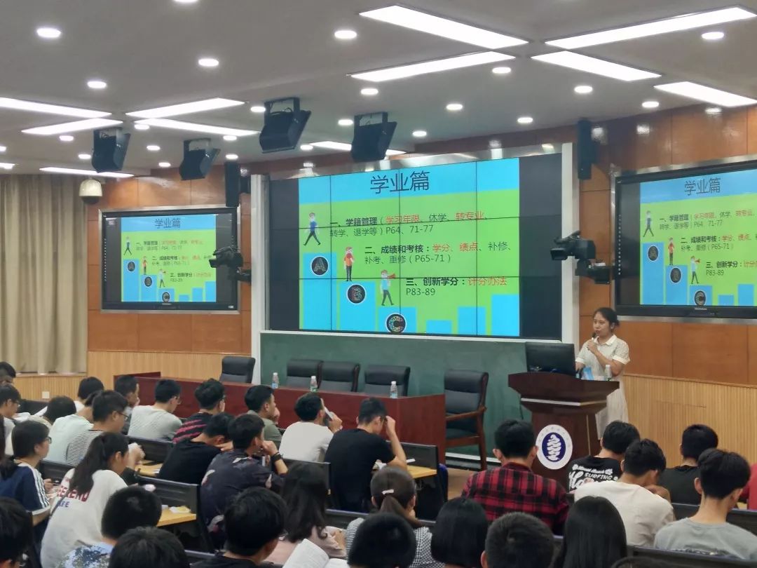 当日下午,我院学工负责人周莹老师,团委负责人张晓阳老师分别为同学们讲解了学校奖惩制度、资助制度、安全教育、党团建设等相关方面的入学教育内容。
